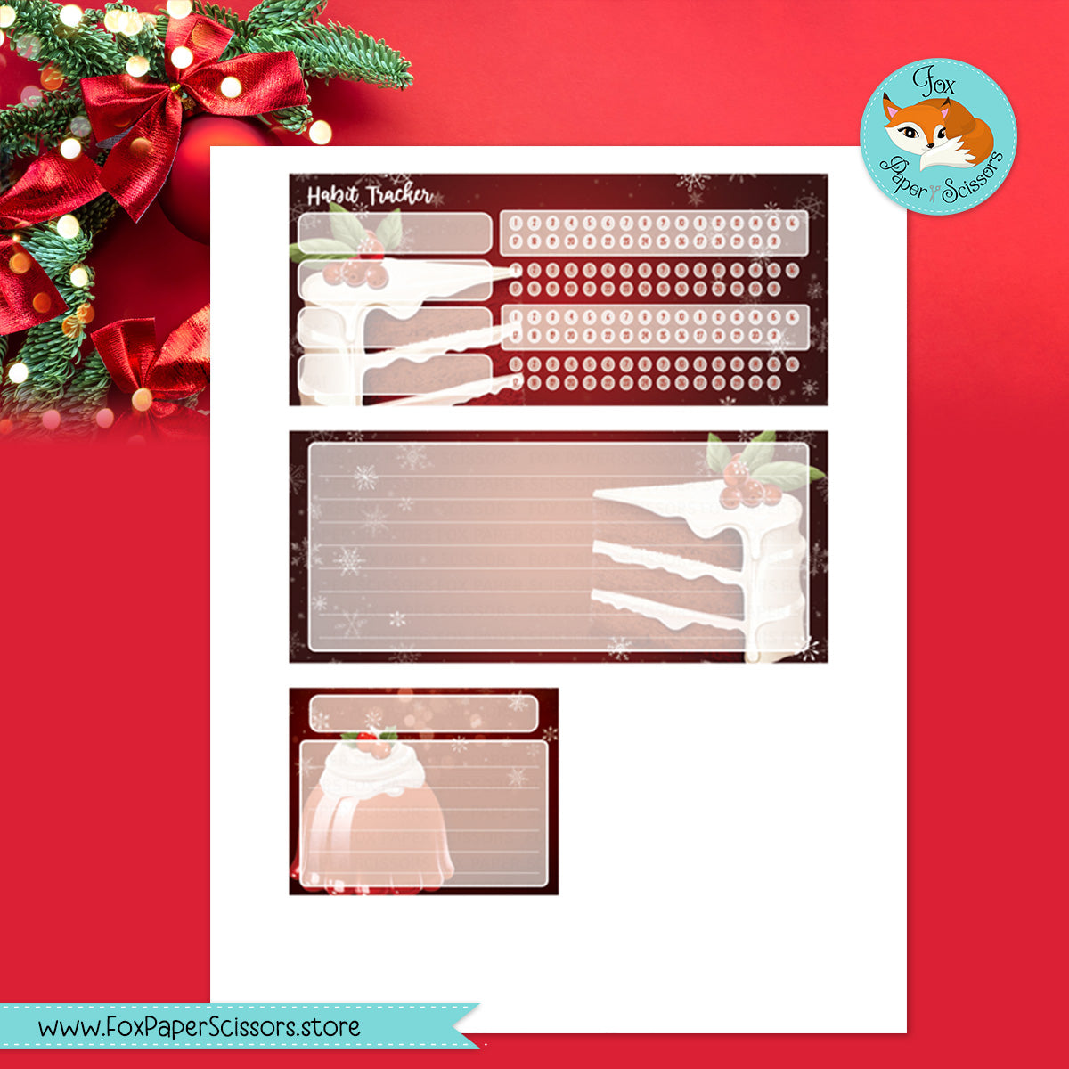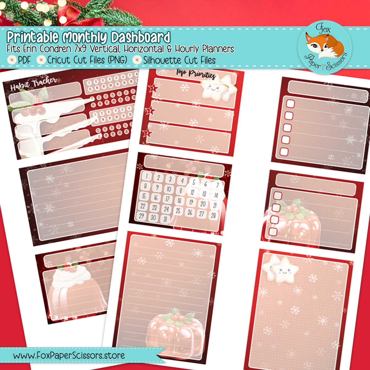 🎄 Yummy Christmas treats on a festive red background decorate this printable monthly dashboard kit for your Erin Condren 7x9 vertical layout Life Planner.